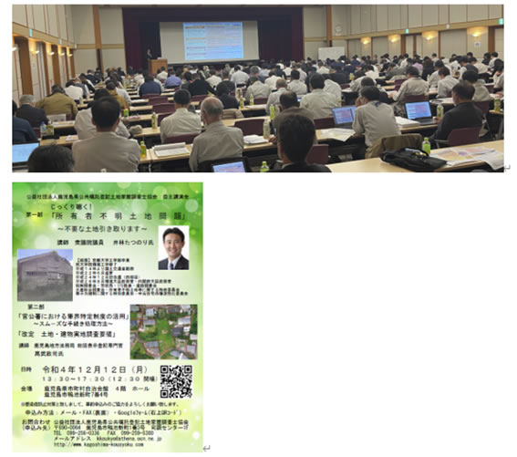 令和4年12月12日、鹿児島県市町村自治会館4階ホールにて、講演会を開催いたしました。当日は、衆議院議員の井林たつのり講師と鹿児島地方法務局総括表示登記専門官の武政司講師をお迎えし、井林講師より「所有者不明土地問題」についてご講演を、武講師より「官公署における筆界特定制度の活用」「改定 土地・建物実地調査要領」についてご講演を頂きました。協会社員はもちろんのこと、官公署職員95名、一般参加者33名を含む187名の方にご参加頂き、盛会のうちに終了致しました。